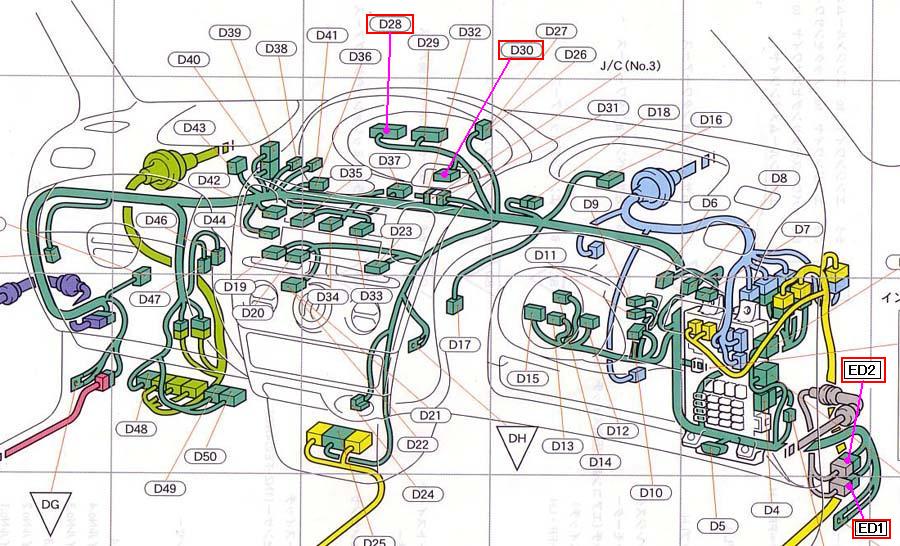 ●メーター裏のコネクタ(D28) 14番(黄):L端子(DLUの灰) ●メーター裏のコネクタ(D30) 1番(白/黒):アース(DLUの黒) 5番(赤):Pシフト信号(DLUの黄) 14番(紫/白)か(黄緑/赤):車速信号(DLUの白) 17番(赤/黒):IG電源(DLUの赤) ●足元のコネクタ(ED1) 5番(青/黒):ACT-信号(DLUの黄) ●足元のコネクタ(ED2) 9番(茶/黄):ロック(DLUの緑) 10番(緑/黒):アンロック(DLUの青) |