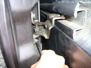 ローラーを外すと、スライドドアの後部が 下がってくるので、ジャッキを使って ドアを支えておきます。 ドアは開けた状態です。 キズが付かないように、 ジャッキとドアの間に雑巾を挟んでいます。 |